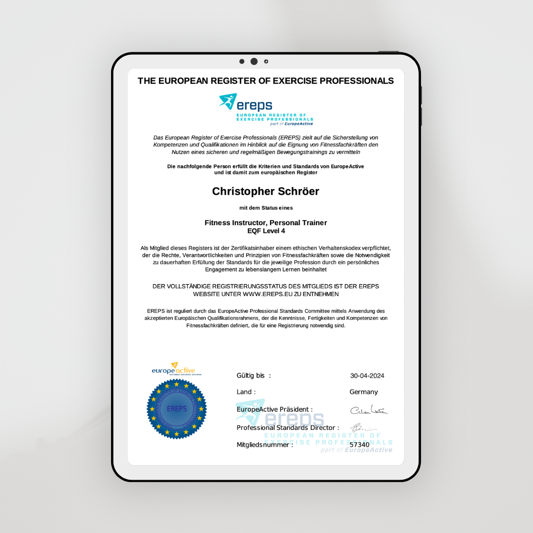 Als Dienstleister verfügt Chris über die Fitnesstrainer B-Lizenz, die Personal Trainer A-Lizenz und ist Mitglied im European Register of Exercise Profession (EREPS). Dieses Zertifikat garantiert, dass Chris als Trainer nachweisbare Qualifikationen erreicht hat und auf die Anforderungen seines Jobs ideal vorbereitet ist.
